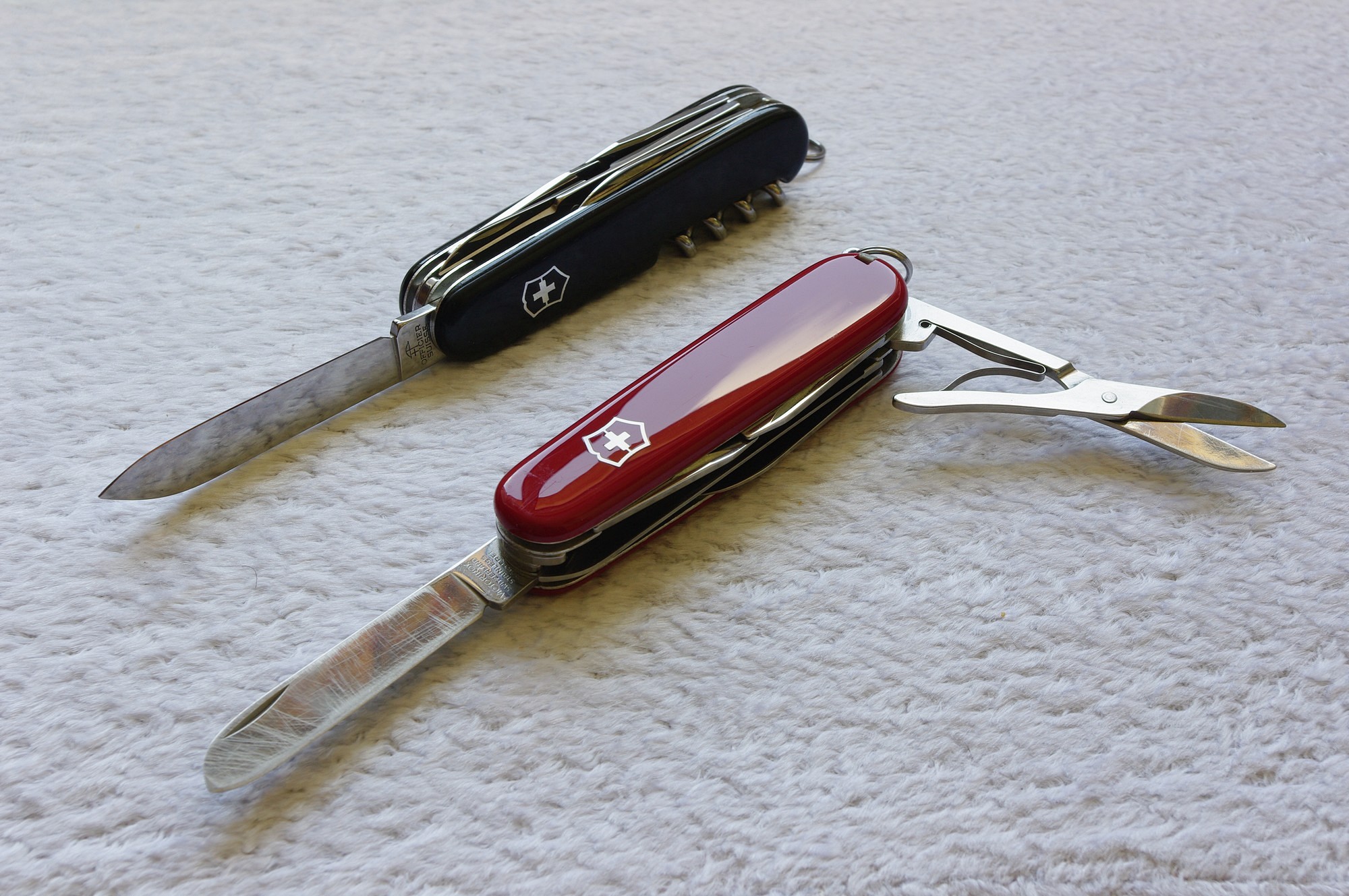 A u mnie spracowany Victorinox Hunstman dostał nowe, czerwone okładki (które już się porysowały - od samego patrzenia chyba... Równie łatwo łapią rysy, co kostka masła w temperaturze dodatniej :roll: ). Dokupiłem mu też używanego przyjaciela, Climbera, w dobrym stanie, jeno nieco przybrudzonego. Na zdjęciu już po dokładnym czyszczeniu. ;-) Oczywiście oba noże są doprowadzone do stanu "golące ostrza". Huntsman ma czubek dużego noża przerobiony na "owcze kopytko", bo złamał się przy dłubaniu w drewnie. Jest mocno porysowany, bo uczyłem się na nim ostrzenia :oops:. Nożyczki ma odbarwione na czubku przez odkażanie w płomieniu i spirytusie. Służyły wraz z pęsetą do wyciągania kilku upierdliwych drzazg. Uwielbiam te niepozorne nożyki. :-D